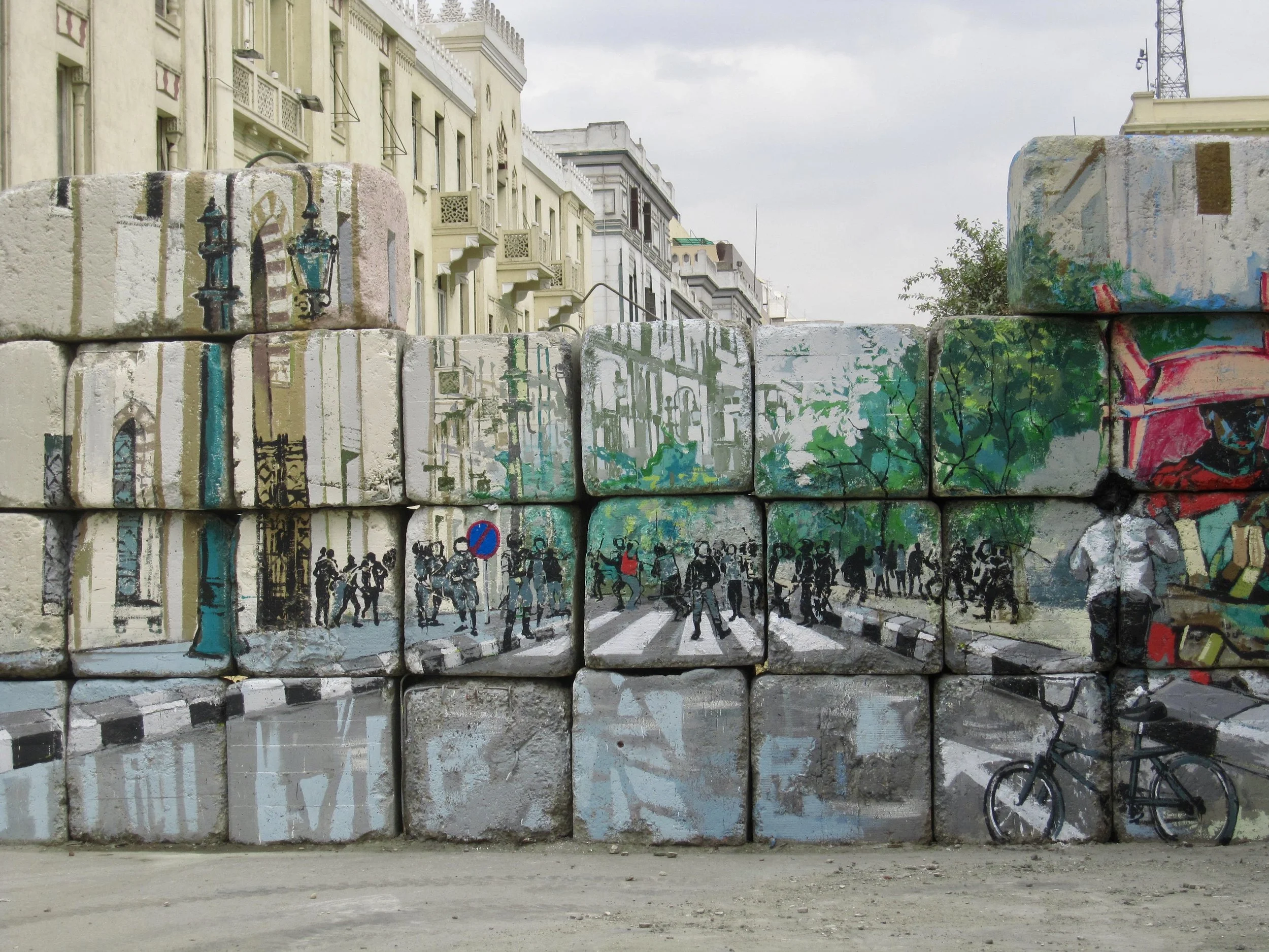 Trompe-l'oeil mural on cinder block barrier at the corner of Tahrir Square, Cairo. 2013.